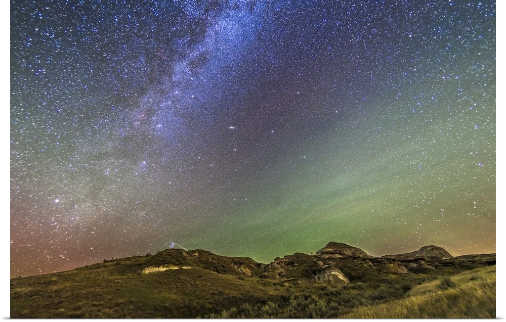 <p>The northern autumn stars and constellations rising in the east over the Badlands of Dinosaur Provincial Park in Alberta, Canada. There was copious green airglow this night, plus some dim aurora to the northeast. Capella is at far left. The Pleiades is just rising over the hill. Messier 31 is at centre. .</p>