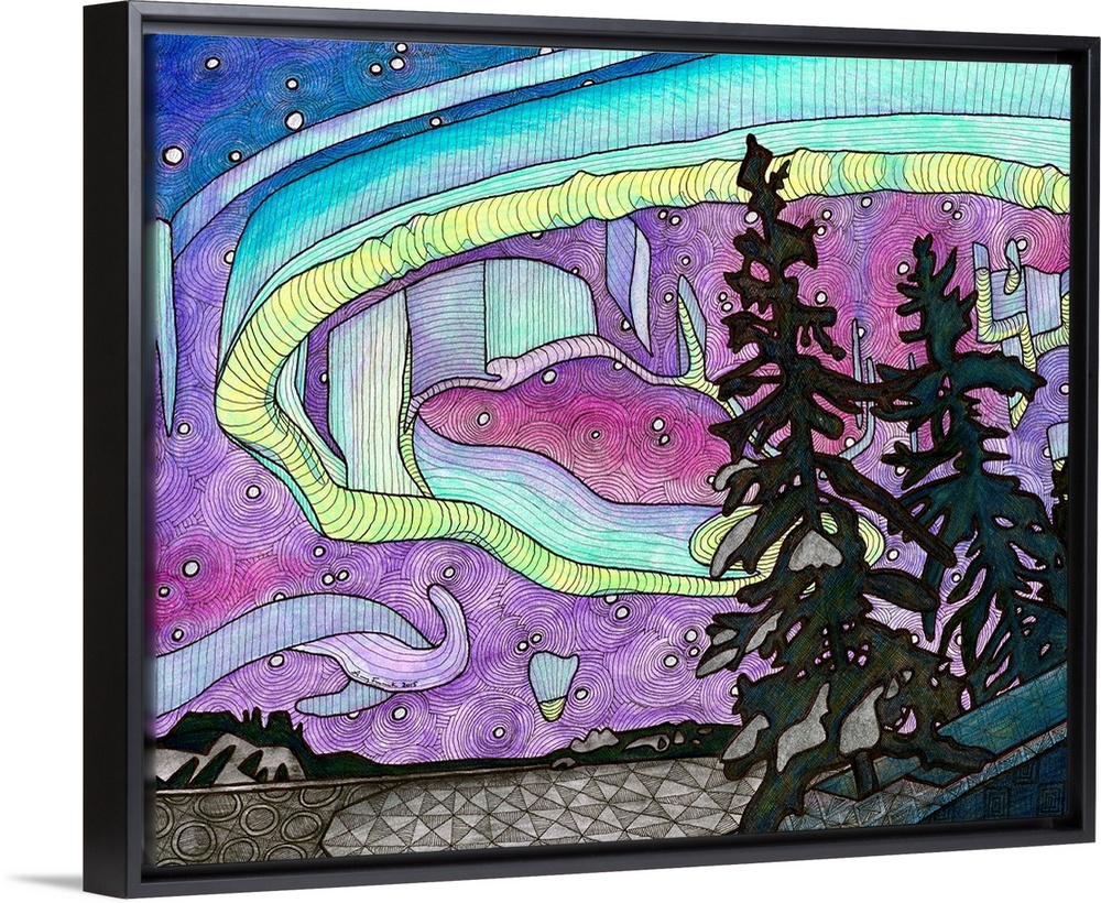<p>Colorful illustration of the Northern Lights in a detailed patterned sky.</p>