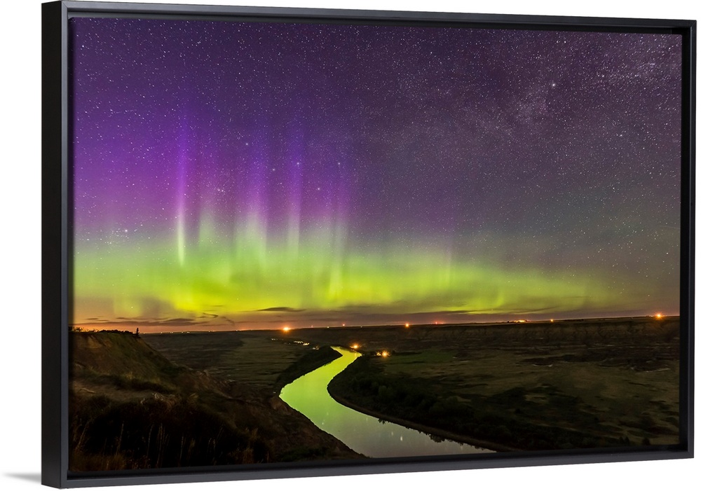 <p>The northern lights dance over the Red Deer River and Badlands of Alberta, Canada.</p>