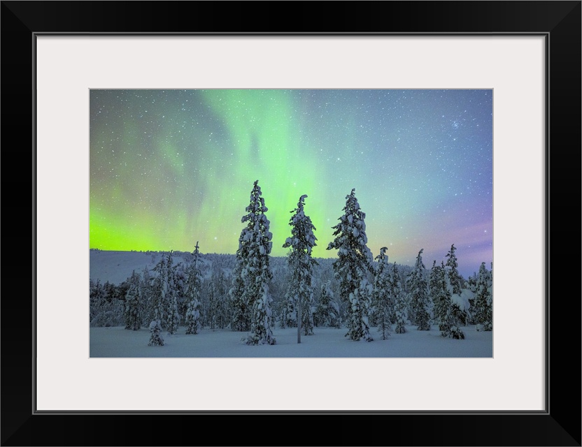 <p>The Northern Lights (Aurora borealis) illuminate the sky near Luosto during a cold winter night, Luosto, Finland, Europe</p>
