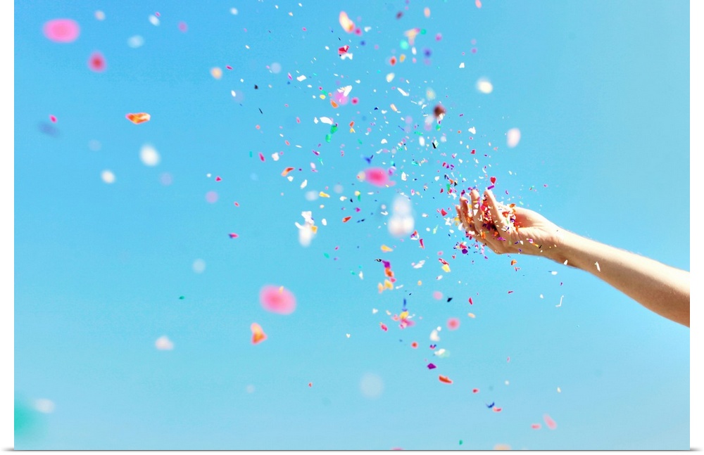 <p>A bright, airy photograph of a hand throwing colorful confetti against a blue sky.</p>
