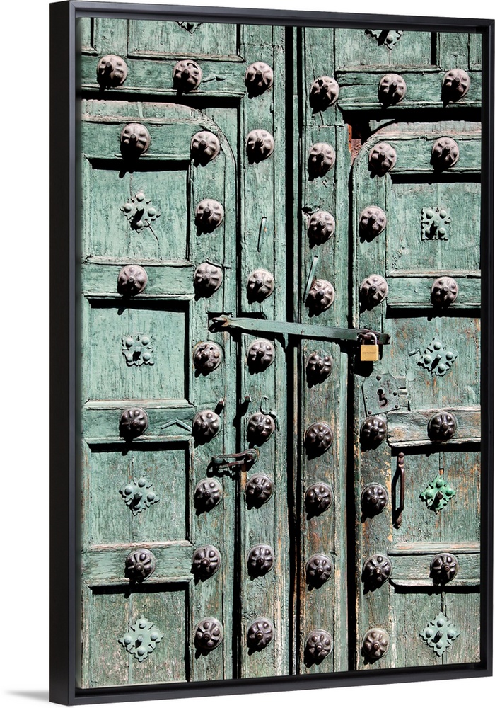 <p>A rustic wooden door painted green with metal embellishments.</p>