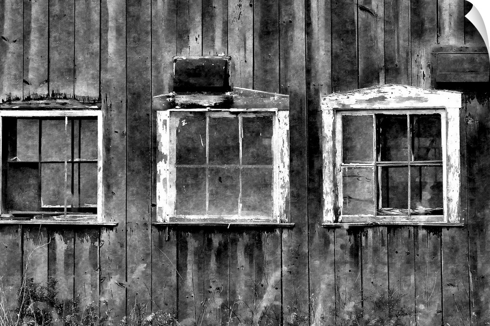 <p>Black and white photograph of three white framed window on an aging barn.</p>