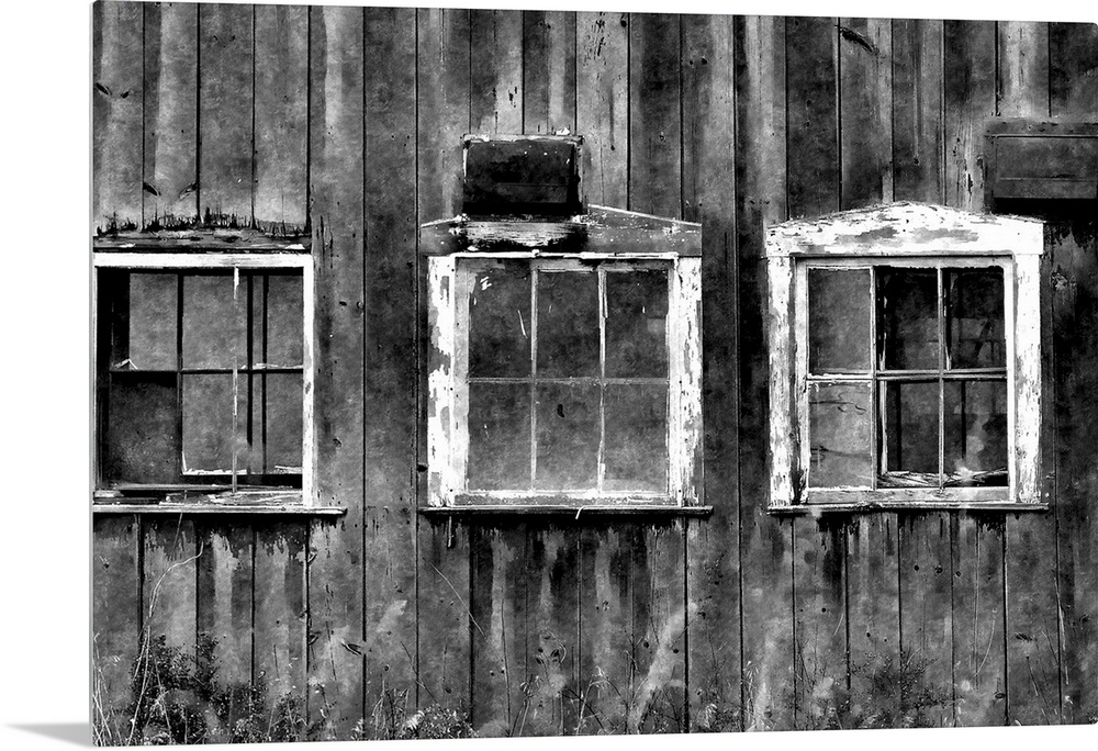 <p>Black and white photograph of three white framed window on an aging barn.</p>