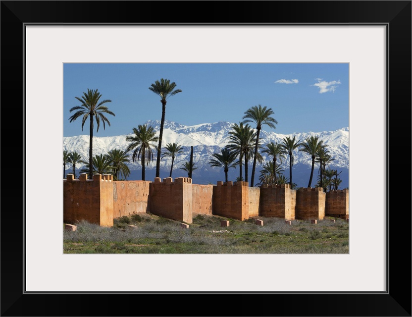 <p>The old city walls and snow capped Atlas Mountains, Marrakech, Morocco, North Africa, Africa.</p>