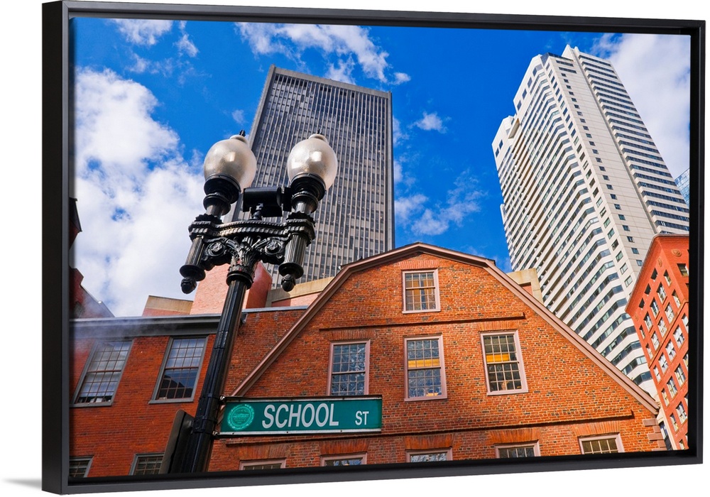 <p>The Old Corner Bookstore on School street (skyscrapers visible), Freedom Trail, Boston, Massachusetts USA</p>