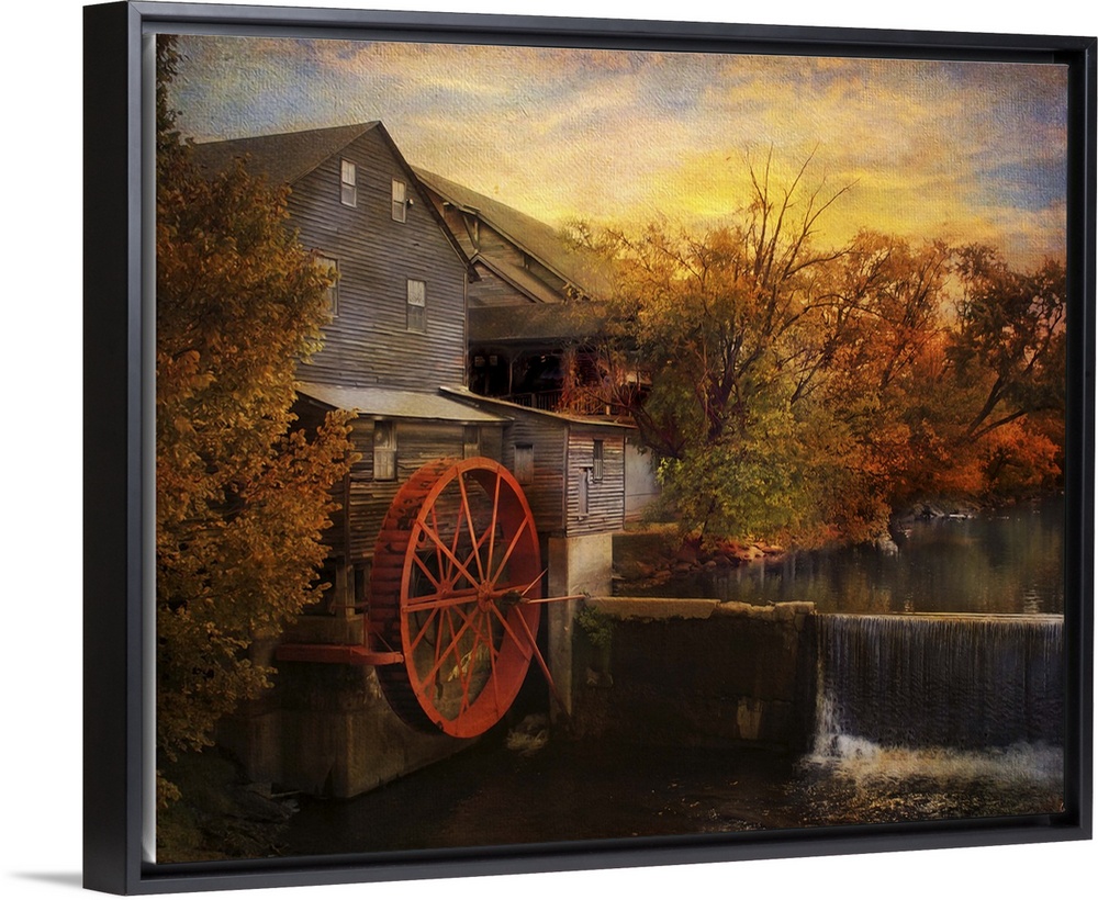 <p>Fine art photo of a water mill at sunset in the fall.</p>