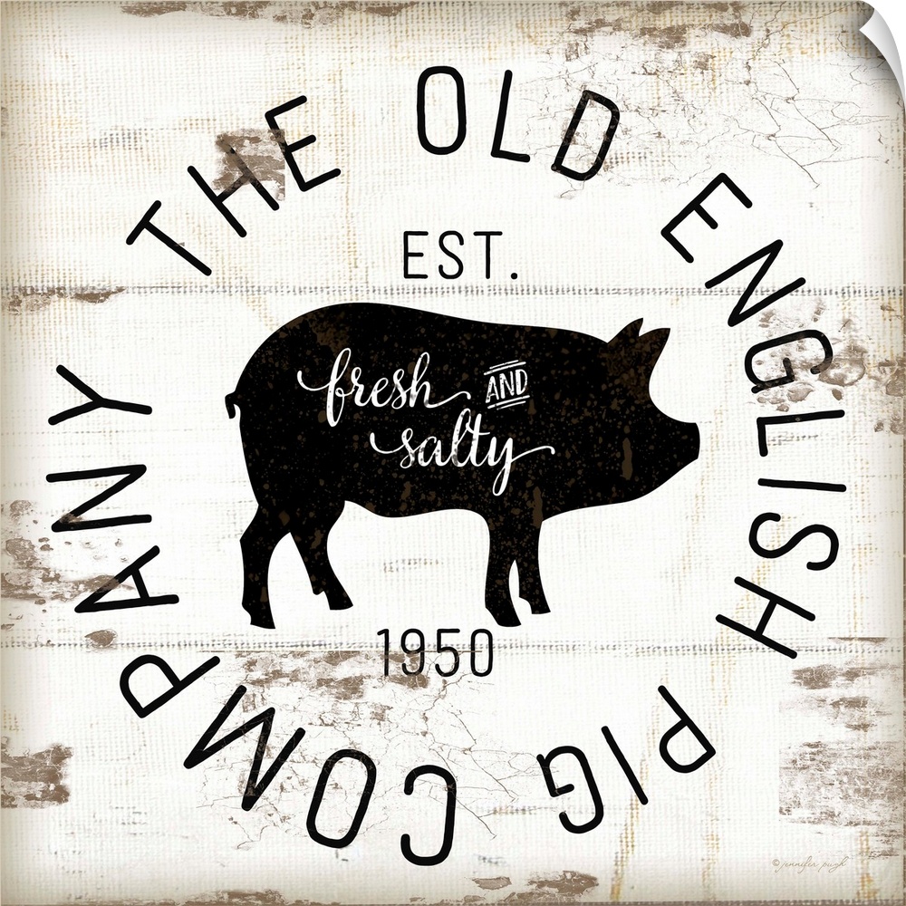 <p>A digital illustration of "The Old Pig Company" on a white shiplap background.</p>