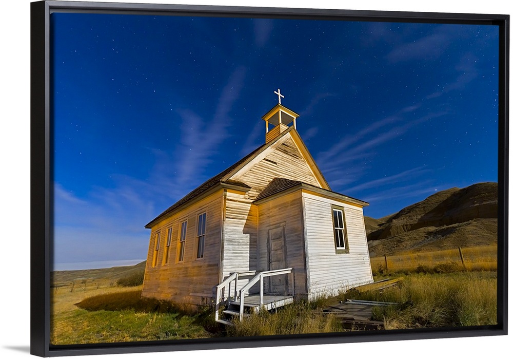 <p>October 9, 2011 - The old pioneer church in Dorothy, Alberta, Canada, on a starry night illuminated by moonlight.</p>