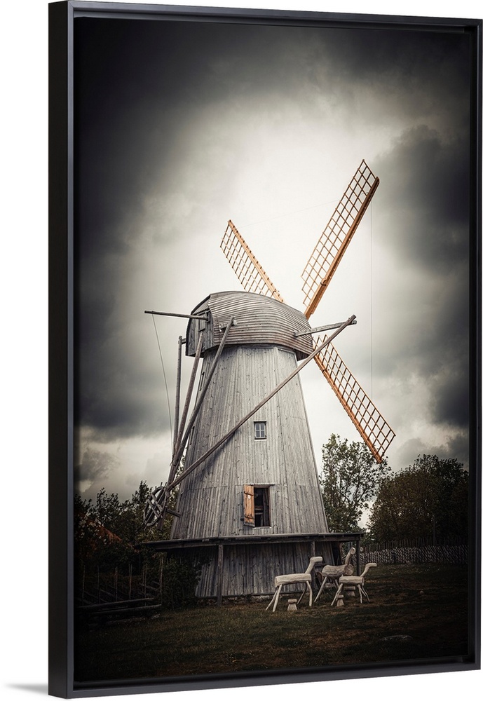 <p>Old windmill close up with stormy sky</p>