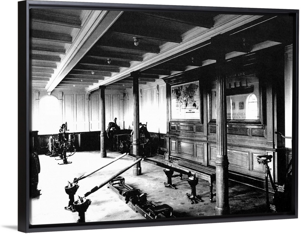<p>Landscape, vintage photograph from 1912 of the exercise room on the Titanic, including a rowing machine and stationary bikes.</p>