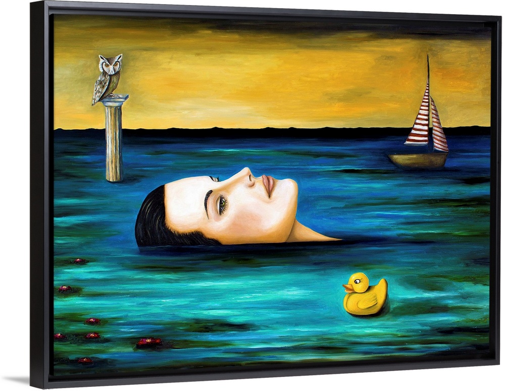 <p>Surrealist painting of a woman floating in dark water with a sailboat in the distance.</p>