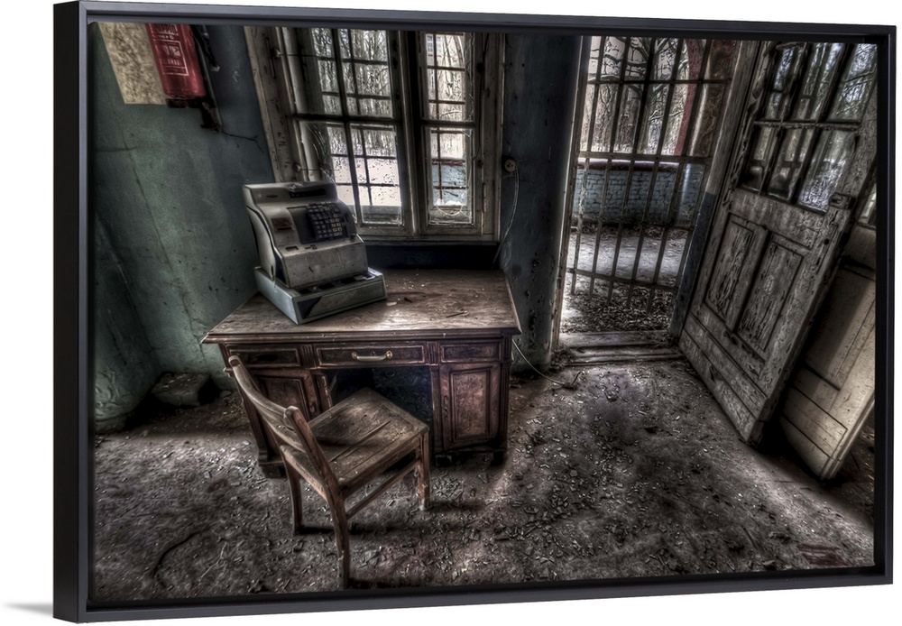 <p>Abandoned lunatic asylum north of Berlin, Germany. Cash till on desk with chair.</p>