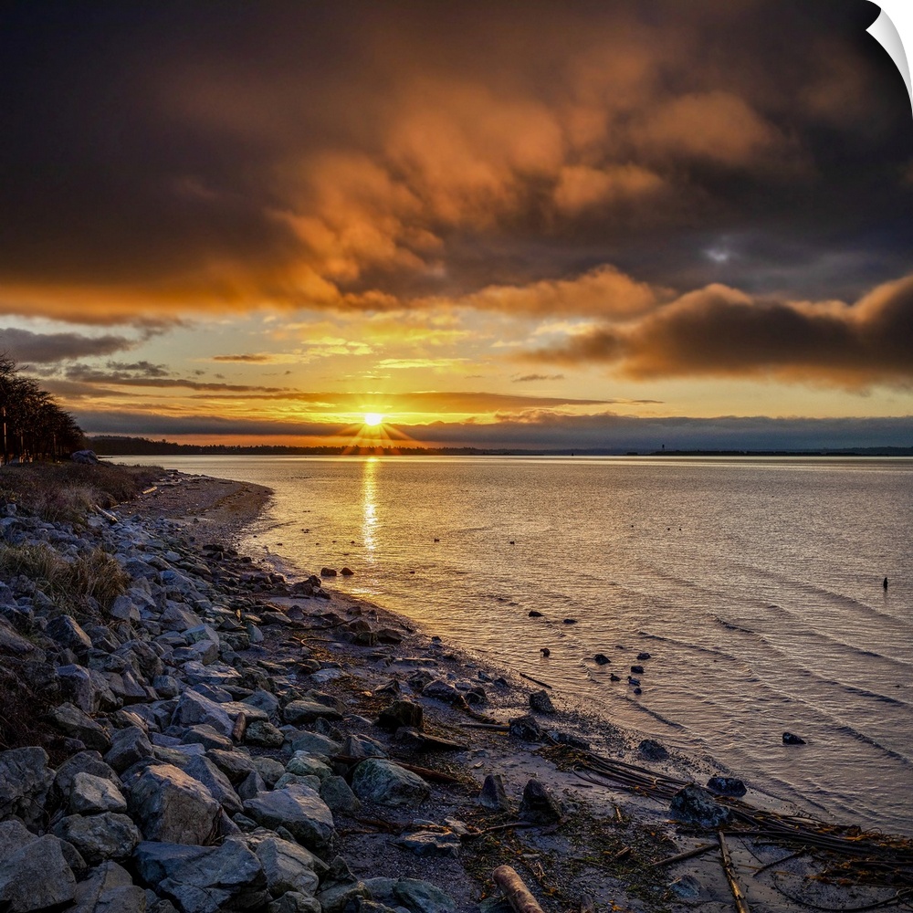 <p>View from rocky shore of dramatic clouds and golden sunburst reflecting on the Pacific Ocean at sunrise, White Rock, British Columbia, Canada</p>