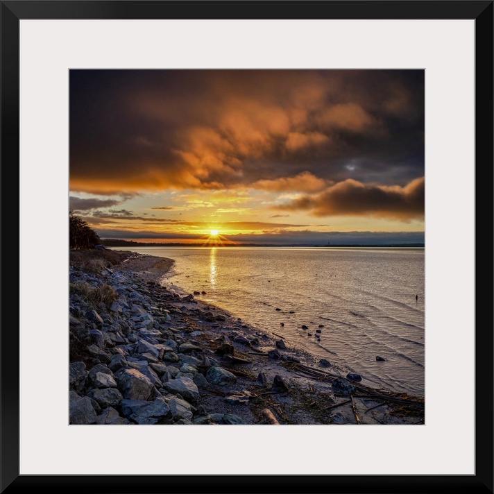 <p>View from rocky shore of dramatic clouds and golden sunburst reflecting on the Pacific Ocean at sunrise, White Rock, British Columbia, Canada</p>