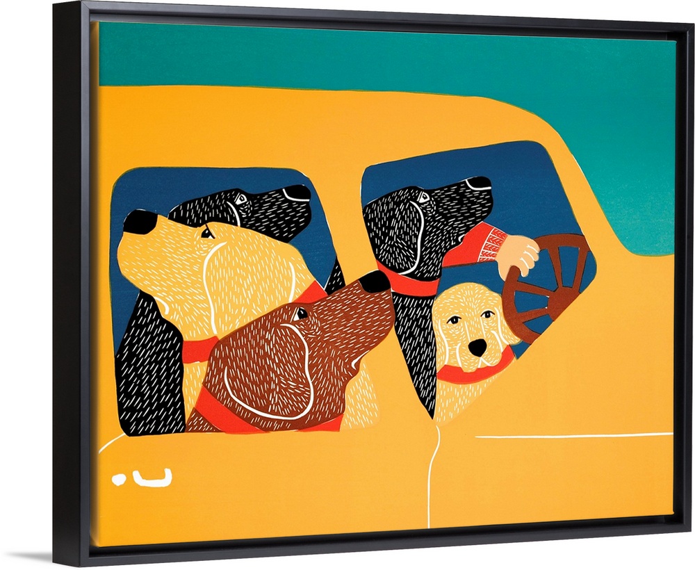 <p>Illustration of a pack of labs in a yellow car.</p>