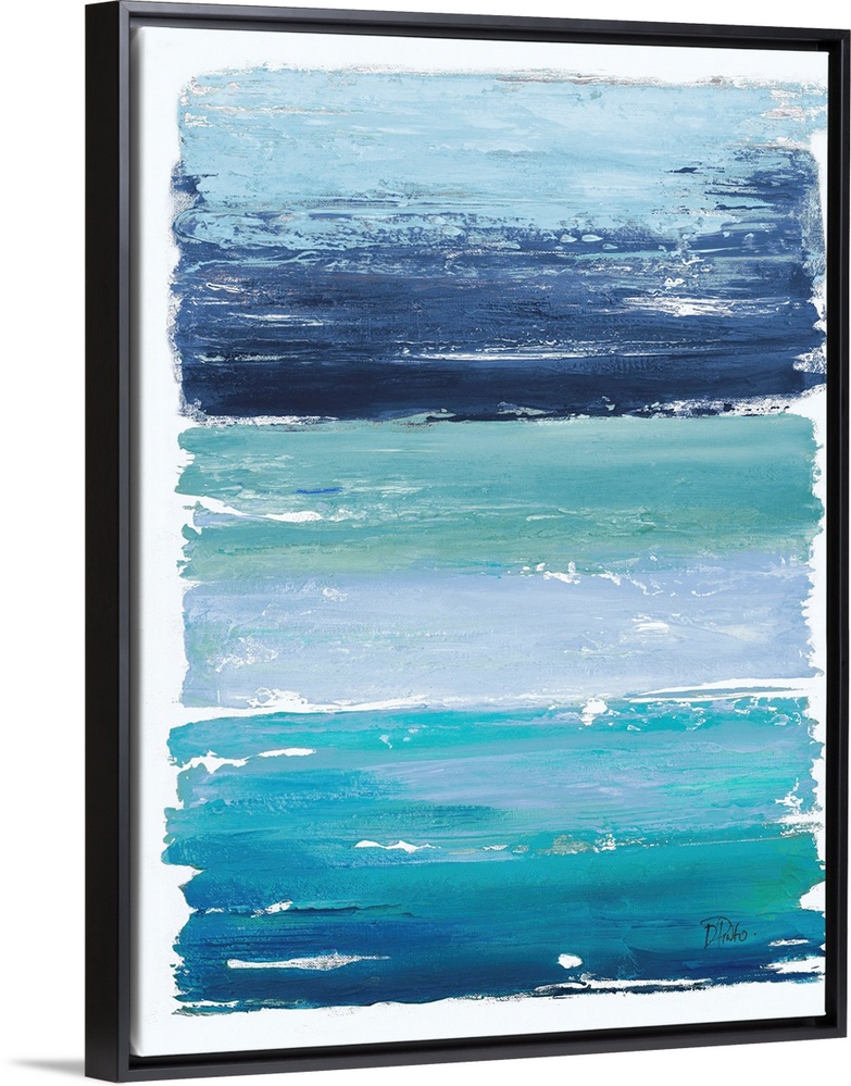 <p>A contemporary abstract painting with thick horizontal brushstrokes stacked on top of each other in different shades of blue.</p>