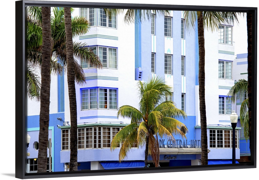 <p>Palm trees frame the blue Art Deco architecture of the Park Central Hotel in Miami Beach.</p>
