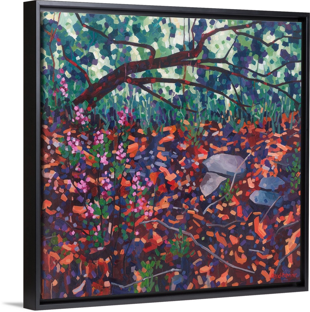 <p>Atmospheric painting of fallen tree with pink flowers and red and orange foreground.</p>