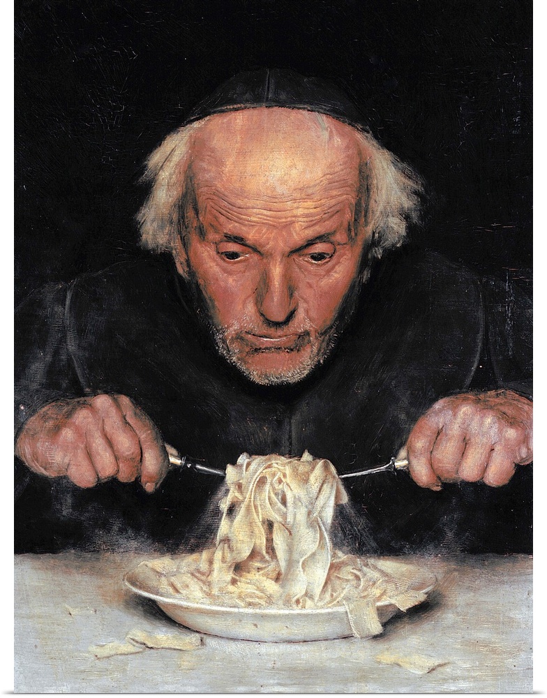 <p>The pasta eater, by unknown artist. Oil on canvas, 19th century. Museo Nazionale delle Paste Alimentari, Rome, Italy.</p>