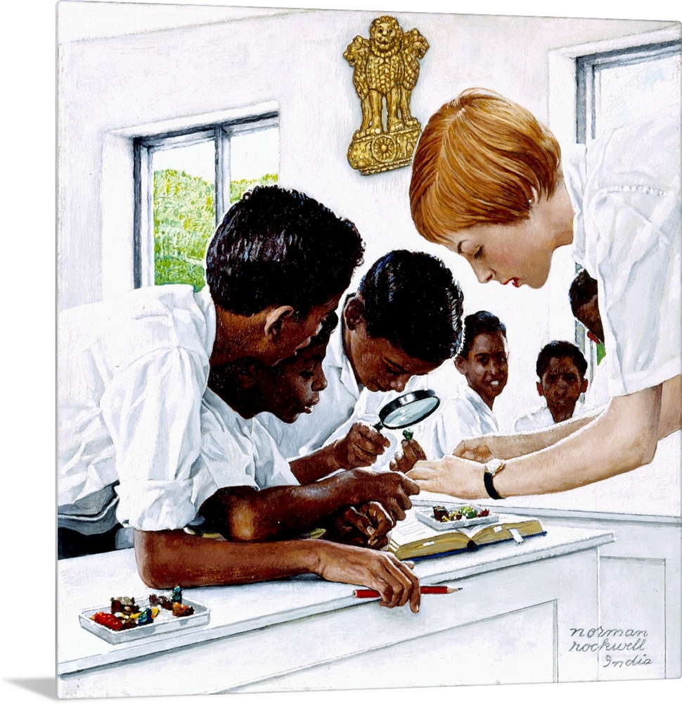 <p>In 1963, Rockwell began to create paintings that allowed him to address more substantive matters. Responsible for helping to shape the perception of American society and culture in the 20th century, Rockwell could be considered a documentarian and a mythmaker. Now free to openly express his views on current events, Rockwell painted some of his most powerful works, which dealt directly with issues like poverty, civil rights, and the Vietnam War. Full Title: The Peace Corps in India 'They have been called "los hijos de Kennedy," JFK's children.' Approved by the Norman Rockwell Family Agency</p>