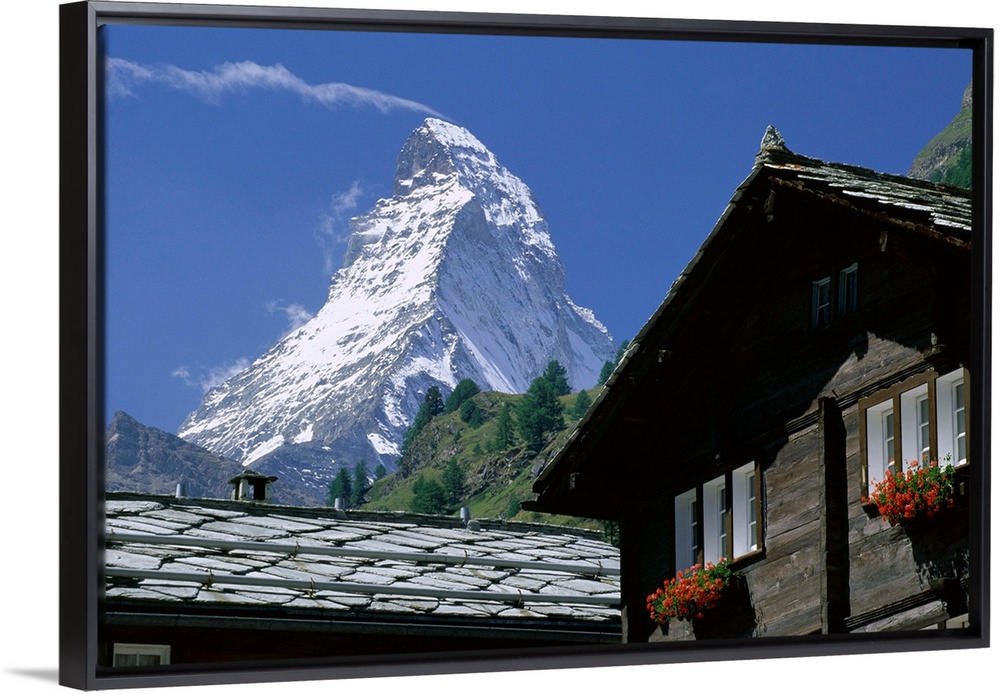 <p>The peak of the Matterhorn mountain towering above chalet rooftops, Zermatt, Valais, Swiss Alps, Switzerland</p>