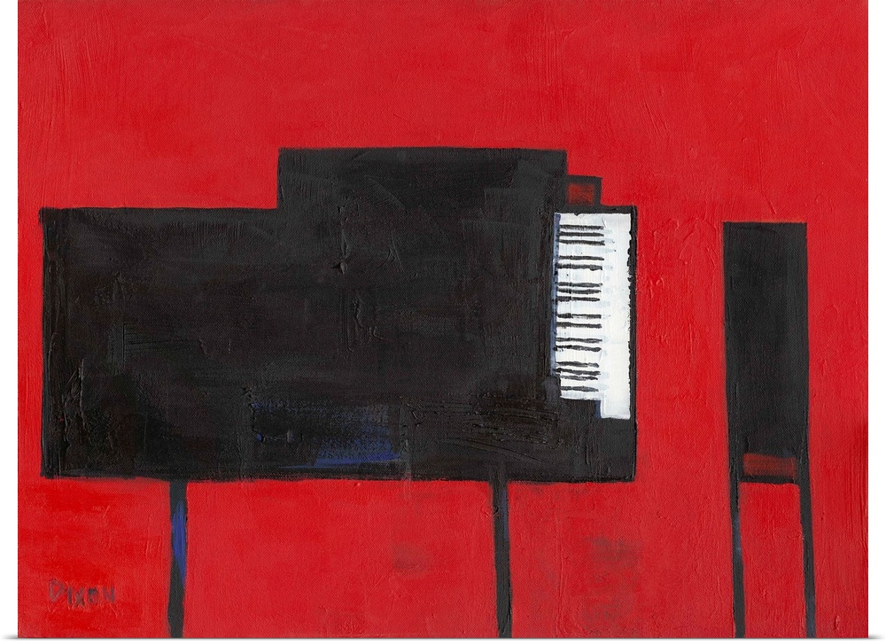 <p>Contemporary painting of a black grand piano and bench on red.</p>