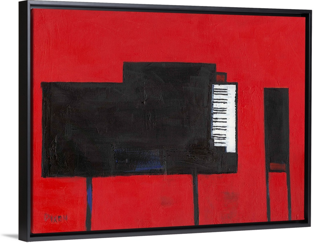 <p>Contemporary painting of a black grand piano and bench on red.</p>