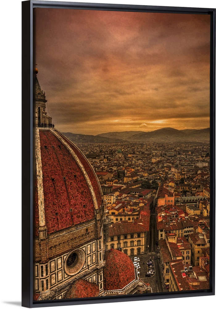<p>Tall canvas photo of vintage Italian buildings with rolling mountains in the distance.</p>