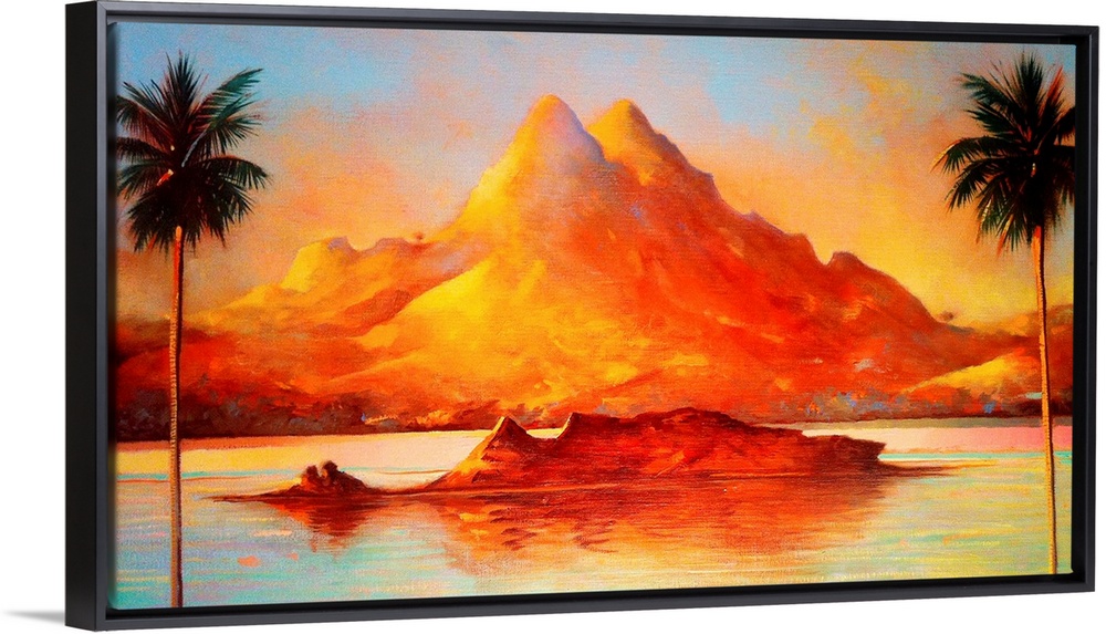 <p>Contemporary painting of a tropical mountainous beach at sunset.</p>