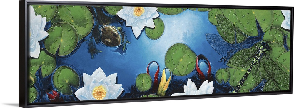 <p>Contemporary painting of a view looking down on a pond with lily pads and dragonflies.</p>