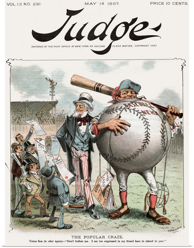 <p>"Don't bother me. I am too engrossed in my friend here to attend to you!" A politicial cartoon showing Uncle Sam too engrossed in baseball to bother with other news. Published in Judge magazine, May 14, 1887.</p>