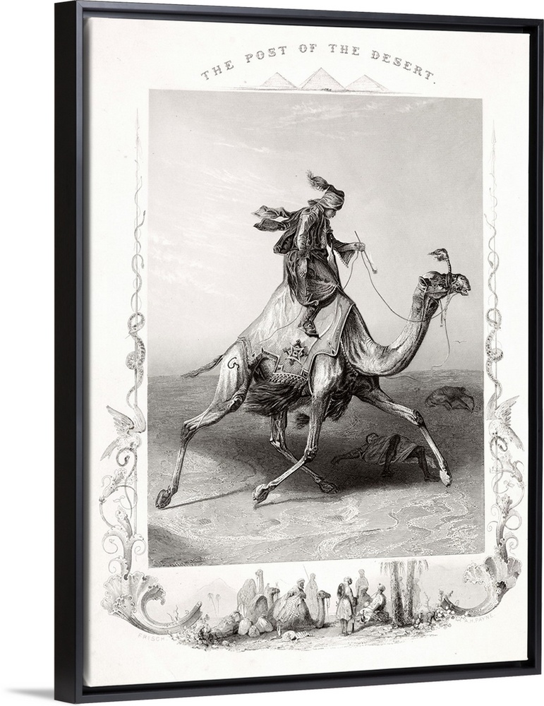 <p>The Post of The Desert. A fanciful 19th century British image representing an Egyptian postman riding a dromedary camel through the desert, while around him lie the corpses of a man and his horse who have presumably died of heat, dehydration, or possibly at the hands of brigands. At the head and foot are depictions of pyramids and of a group of Bedouin camel riding merchants in an oasis, relaxing under palm trees with armed guards. A pyramid is in the background. Several are smoking long pipes.</p>