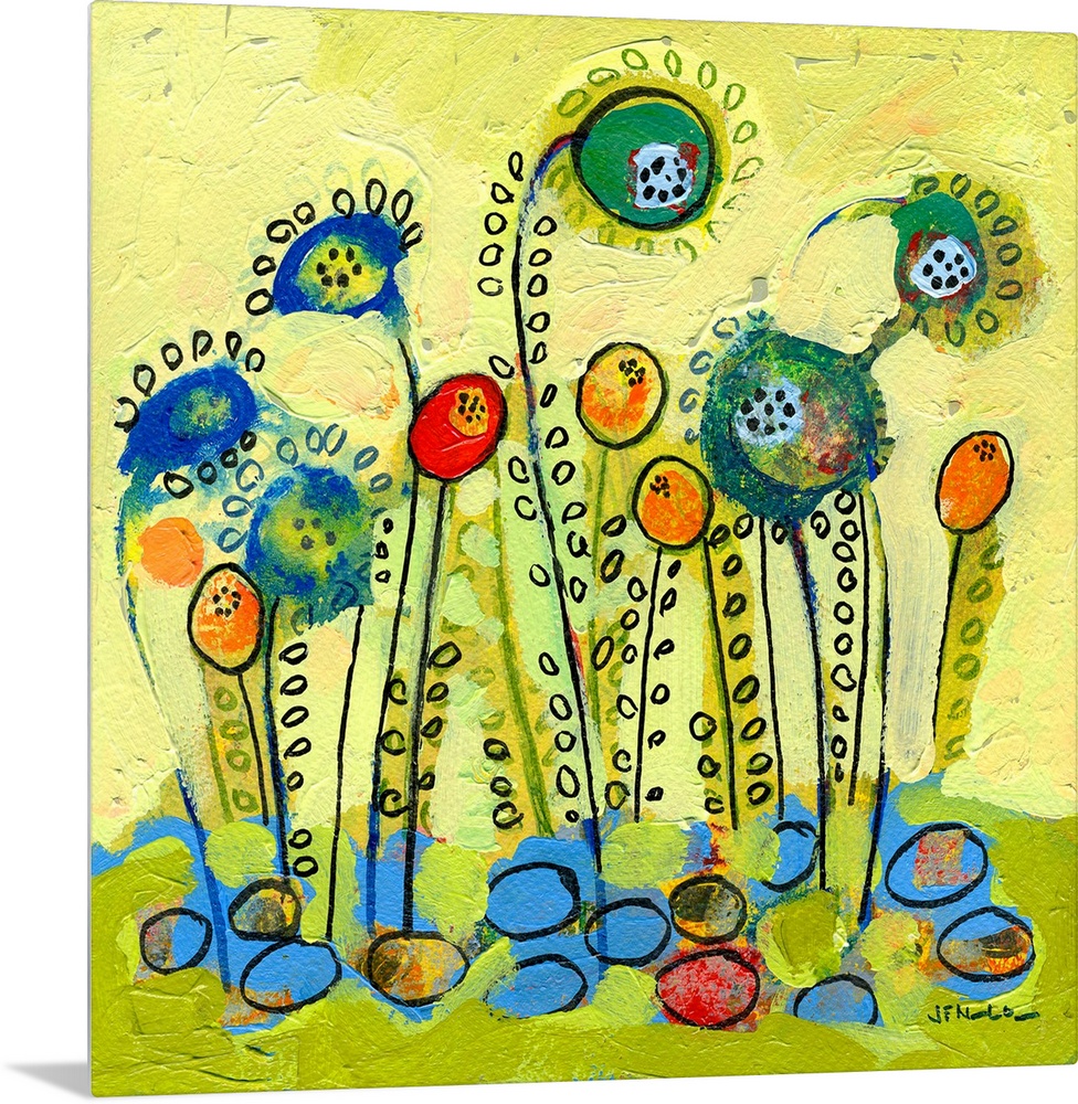 <p>Contemporary abstract painting of seeds blossoming into flowers. Simple shapes are used to create the image.</p>