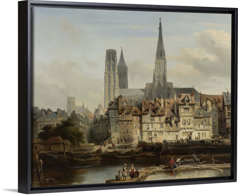 <p>The Quay de Paris in Rouen, by Johannes Bosboom, 1839, Dutch painting, oil on canvas. Wharf with moored ships, wagons, and people on the Siene river, with gothic cathedral of Rouen in the background.</p>