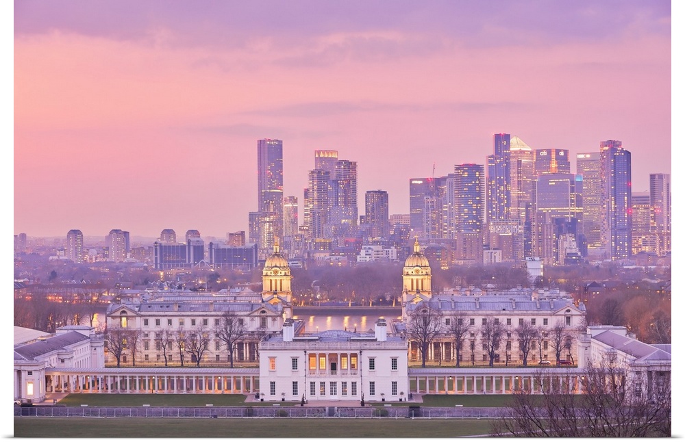 <p>The Queen's House, National Maritime Museum, and the Old Royal Naval College with the Canary Wharf skyline at twilight, Greenwich, London, United Kingdom, Northern Europe.</p>