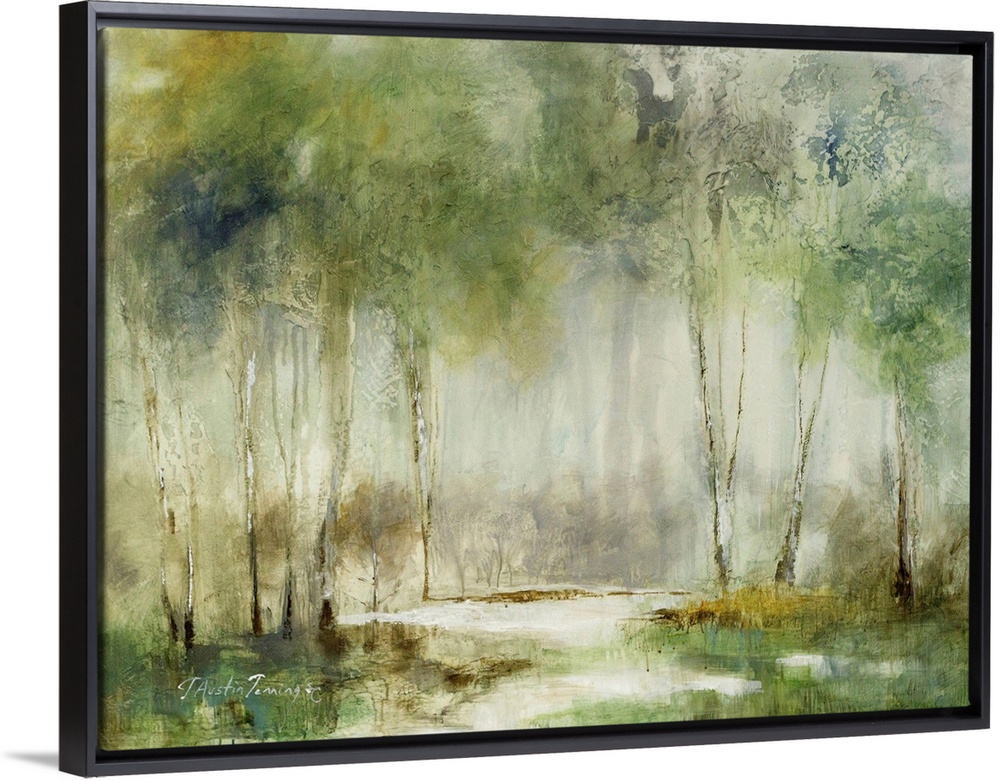 <p>Abstract landscape painting of a forest in muted green hues.</p>