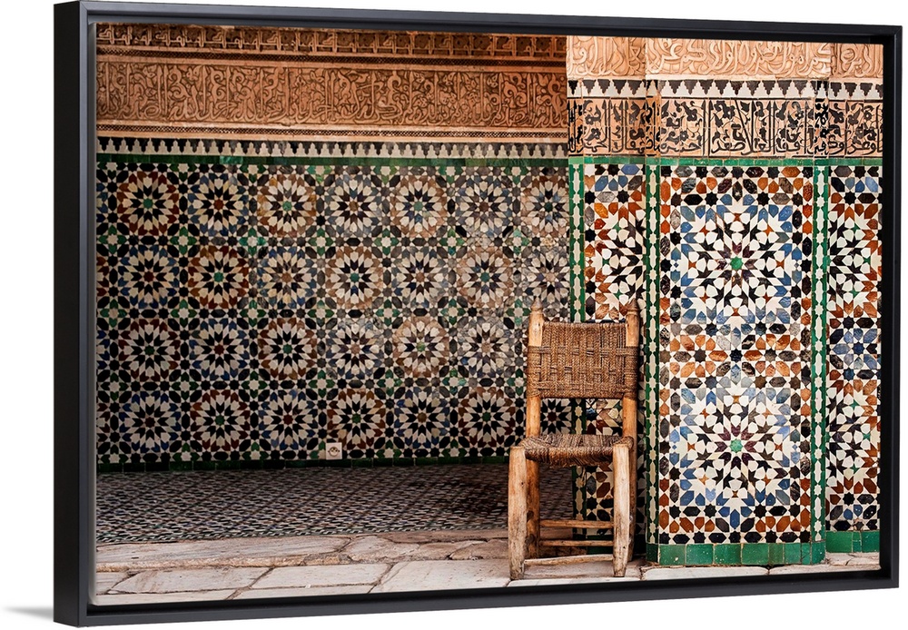 <p>Photograph of a wooden chair with a woven seat and back against beautifully tiled exterior walls.</p>