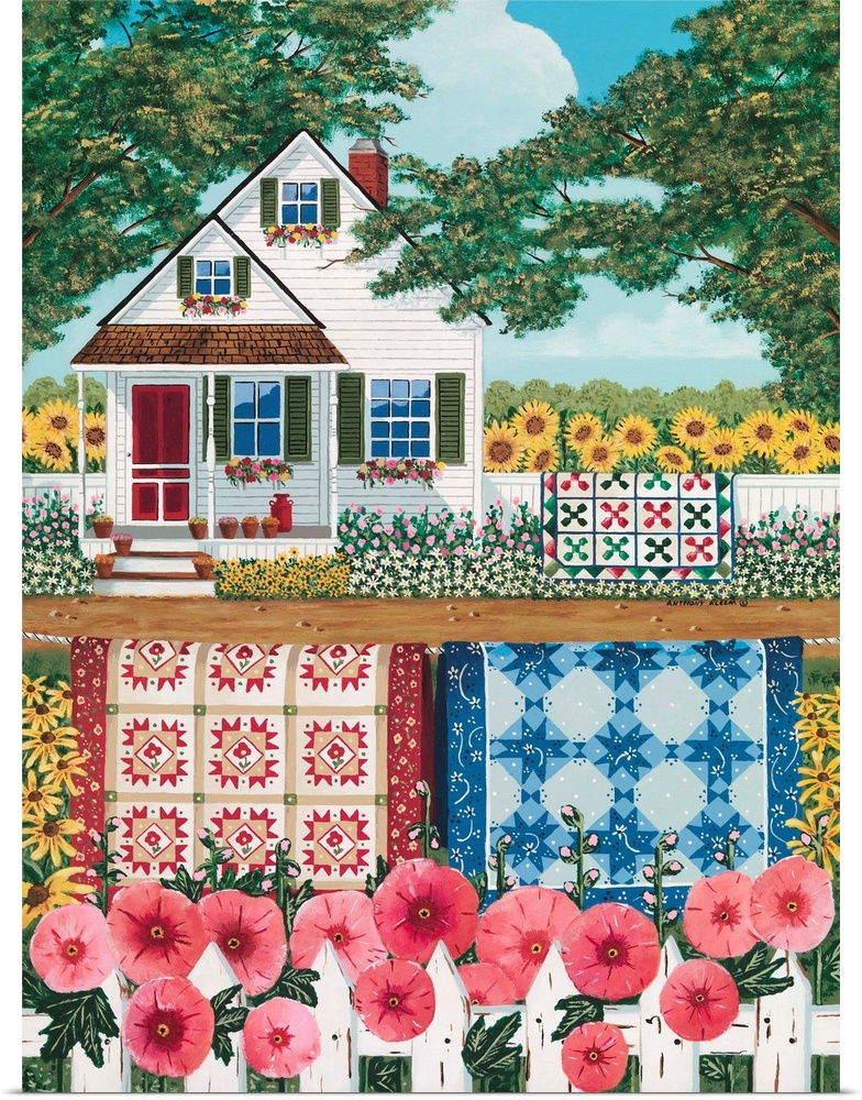 <p>Contemporary Americana painting of a white house with a white picket fence out front covered in pink flowers.</p>