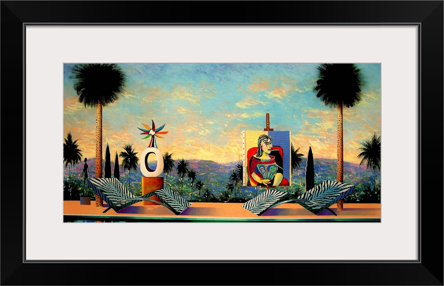 <p>Contemporary expressionist painting of canvases on easels set up outside with lounge chairs.</p>