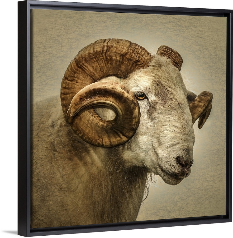 <p>Close up portrait of a majestic ram with large horns.</p>