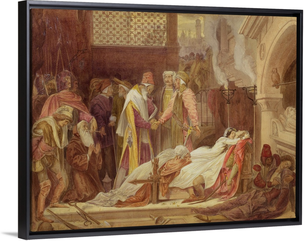 <p>XYC153233 The Reconciliation of the Montagues and the Capulets, c.1854 (w/c, bodycolour and gum over graphite on paper) by Leighton, Frederic (1830-96); watercolour, bodycolour and gum over graphite on paper; 39.7x51.8 cm; Yale Center for British Art, Paul Mellon Fund, USA; ; English, out of copyright</p>