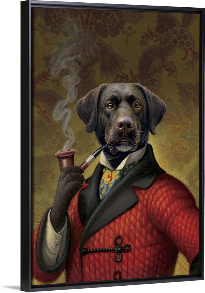 <p>Dog in red smoking jacket smoking a pipe.</p>