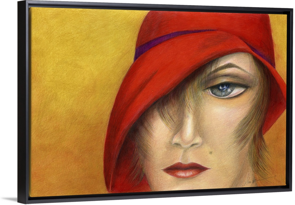 <p>A horizontal contemporary painting of a female in a red hat.</p>