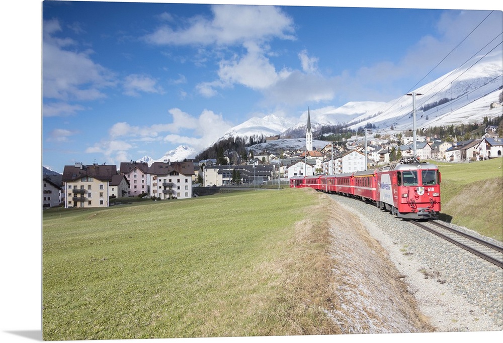 <p>The red train runs across the alpine village of Zuoz in spring, Maloja, Canton of Graubunden, Engadine, Switzerland, Europe</p>