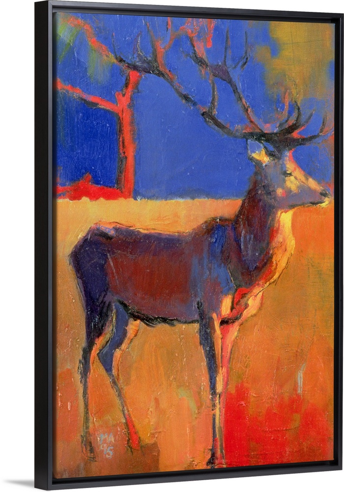 <p>A painting created by a contemporary artist of a deer with enormous antlers standing in an abstract landscape where jagged linear shapes in the background are reminiscent of a tree in this vertical wall decor.</p>