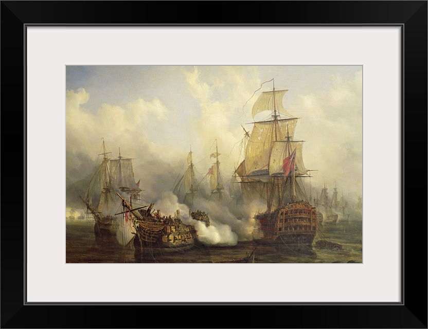 <p>Landscape, large classic painting of several ships battling in the water, clouds of smoke surrounding the ships from canon fire. There is a large fleet of ships in the background, beneath a partly cloudy sky.</p>
