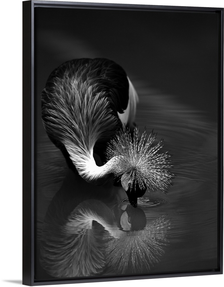 <p>A Crowned Crane dips its head into the water, touching its mirror reflection.</p>