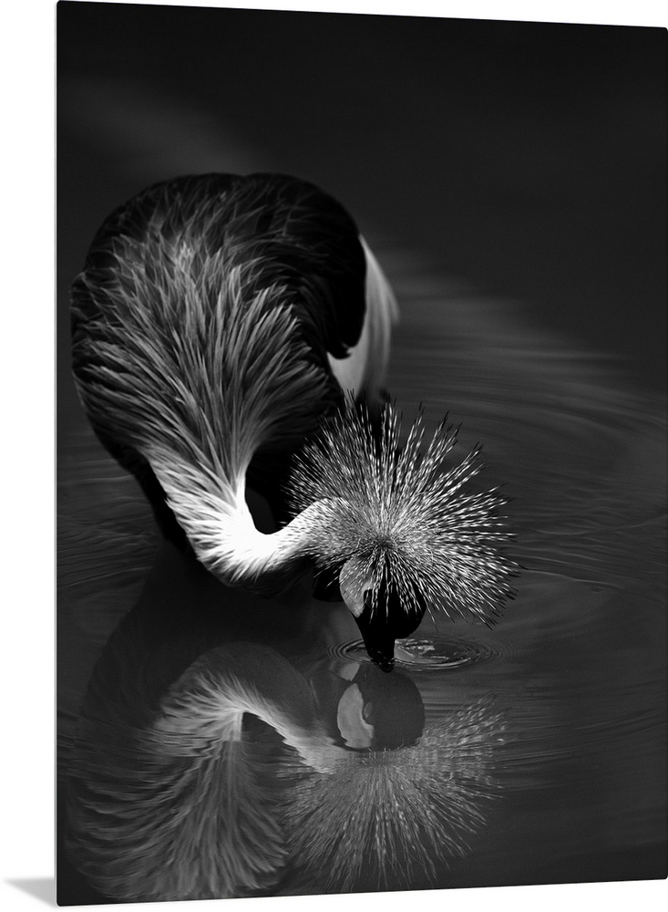 <p>A Crowned Crane dips its head into the water, touching its mirror reflection.</p>