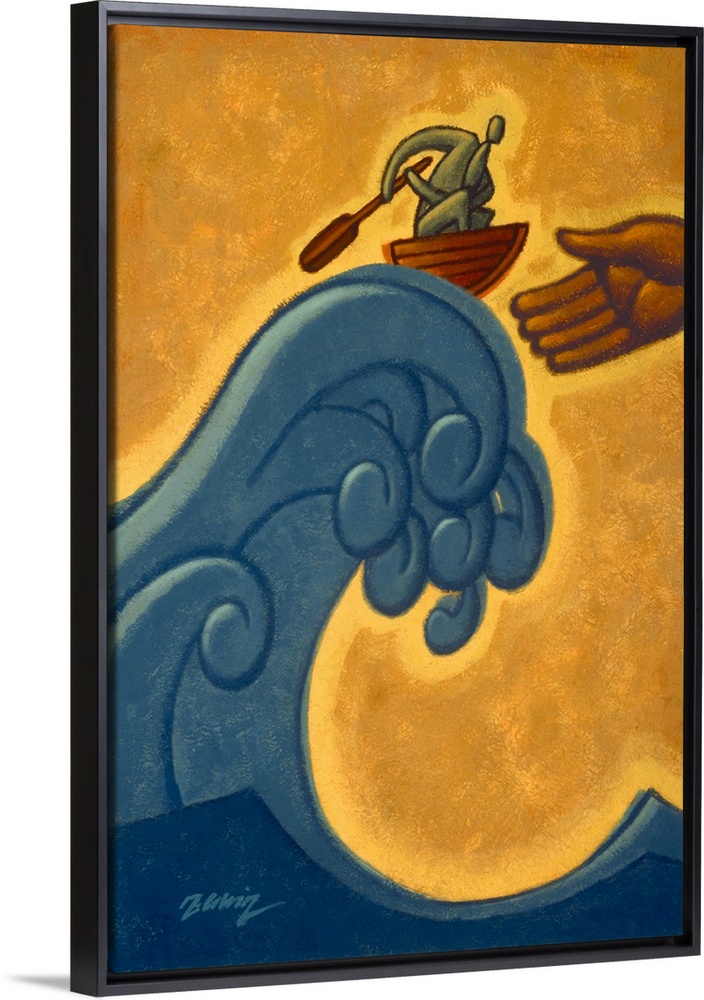 <p>Contemporary painting of a man in a boat riding a big wave, an outstretched hand reaching out to rescue him.</p>
